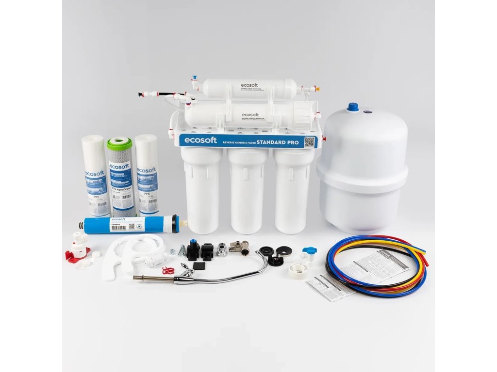 Osmotické filtre Ecosoft so zásobníkom vody sú vhodné do pristorov, kde tlak vstupnej vody neklesá pod 3bar.. Zásobník vody je potrebný, pretože zariadenie má kapacitu iba 0,1 litra / minútu, takže je potrebné vodu filtrovať do zásobníka. Zo zásobníka vodu vytláča membrána na vlastný vodovodný kohútik.